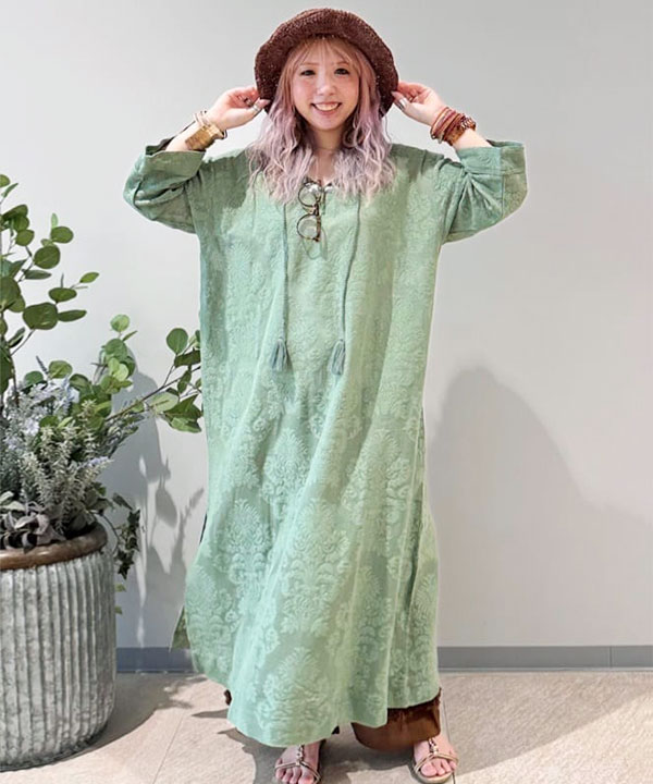 ウズベキスタンを彷彿とさせる、アラベスク柄のコットンレースを使用したワンピース。透け感のあるレース素材が印象的。すっきりとしたシルエットで、ネックラインにはアラベスク建築のモチーフを刺しゅうしました。