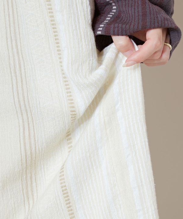 南インドの織生地を使用したストレートワイドパンツ。綿素材で肌触りと通気性が良く、サイドにポケットもついており機能性も抜群。ストライプと織柄の組み合わせがポイントの一枚。ウエストは紐付きで調節可能。裏地付き