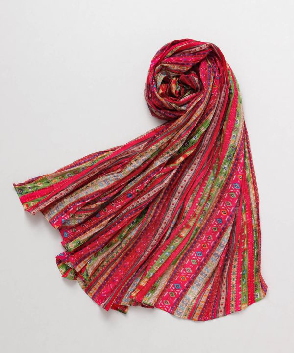 さらりとした手触りのポリエステル100%ストール。インドモチーフの柄はストライプなので、スタイルをすっきりみせてくれます。軽くもたつかないのでオールシーズン使用可。コーデのポイントにも主役にもなります。