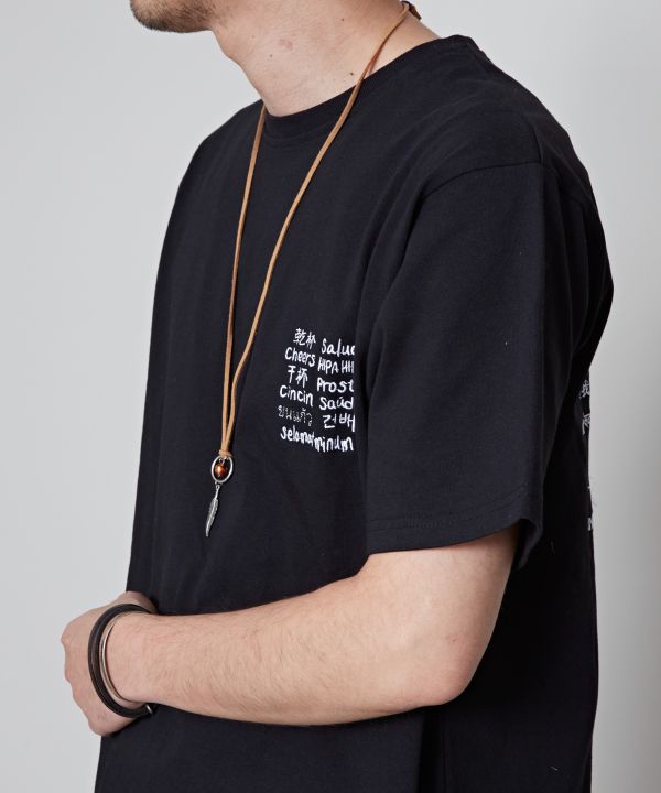 【Amina×grn×横浜ビール】世界各国の「乾杯」の言葉を刺しゅうした、キャッチーなデザインのメンズTシャツ。L/XLサイズ展開なのでゆったりと着られるアイテム。