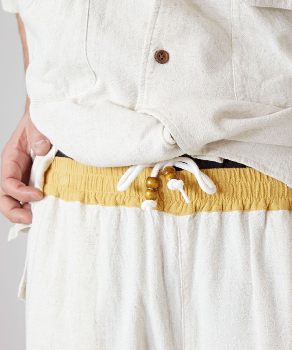 【Amina×grn×横浜ビール】ビールの材料である麦とホップモチーフを、クロスステッチ風の刺しゅうがポイントのメンズハーフパンツ。柔らかい麻混素材、ウエストはゴム仕様と、着心地も軽い一枚。サイドと後ろにはポケットもついており機能性も抜群のアイテム。