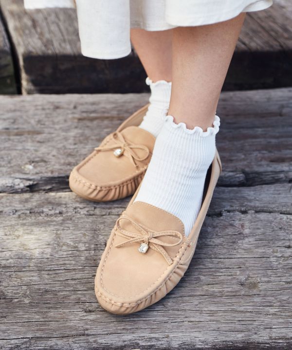 キラリと輝くチャームが可愛らしいモカシンシューズ。生地が柔らかく、底のクッションも効いていて長時間歩いても疲れにくい抜群の履き心地。様々な洋服に合わせやすい色展開で、一年中お使いいただけます。