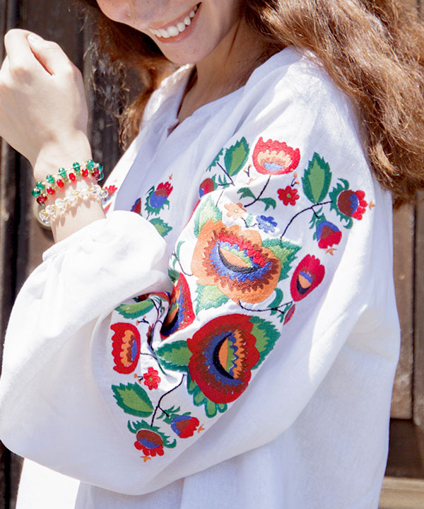 「ヴィシヴァンカ」と呼ばれるウクライナ刺しゅうのブラウス。モチーフの一つであるお花が胸元や袖にあしらわれています。ゆったりとした袖がより可愛らしい印象に。着心地の良いリネン生地が使われており、季節問わずに着用していただけます。スカートやパンツと合わせての普段使いや特別な日にもおすすめ。