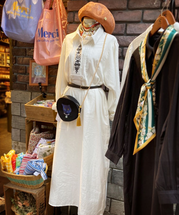 チロル地方の民族衣装「チロリアンシャツ」をイメージしたマキシ丈ワンピース。スイスとオーストリアの国花であるエーデルワイスの刺しゅうを胸元にあしらいました。ゆったりサイズのワンピースはシルエットを気にせず着用でき、お出かけもリラックスムードに。ウエストをベルトマークすれば、また違った印象になり、女性らしいシルエットとクラシカルな雰囲気をお楽しみいただけます。