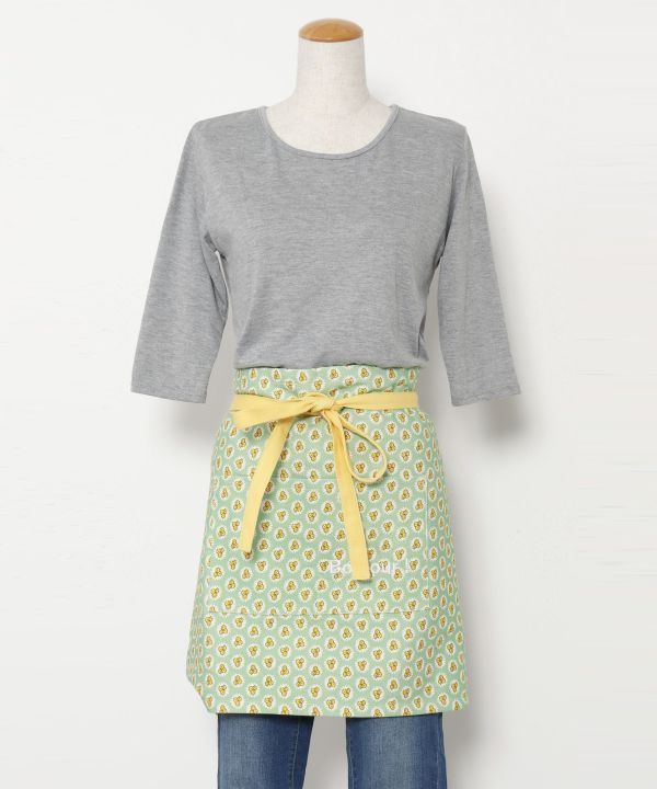 南仏プロバンスの植物模様を表現したカフェエプロン。フランスの挨拶「BONJOUR !(こんにちは!)」の刺繍がポイント。便利なポケット付き。
