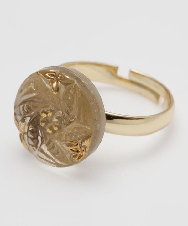 チェコのガラスボタンをアレンジした、小ぶりなリング。コーデに馴染みやすいやさしいカラーで、レトロな花柄が素敵。サイズ調整可能です。ガラスボタンは、現地の工房で昔ながらの手作業でひとつひとつ丁寧に作られています。