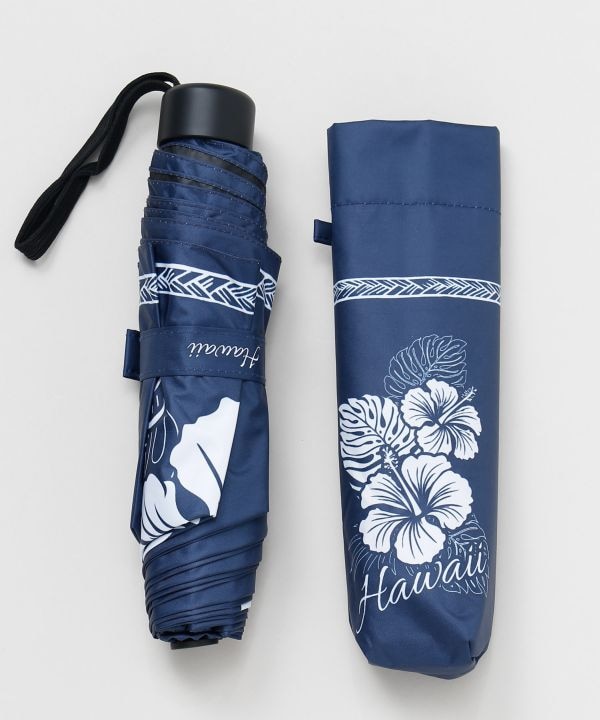 UVカット加工を施した晴雨兼用の折りたたみ傘。ハワイアンデザインが上品に映え、遮光・遮熱効果で一年中快適に使用可能。持ち手のバンブーがナチュラルな高級感を添える、携帯にも便利なアイテム。