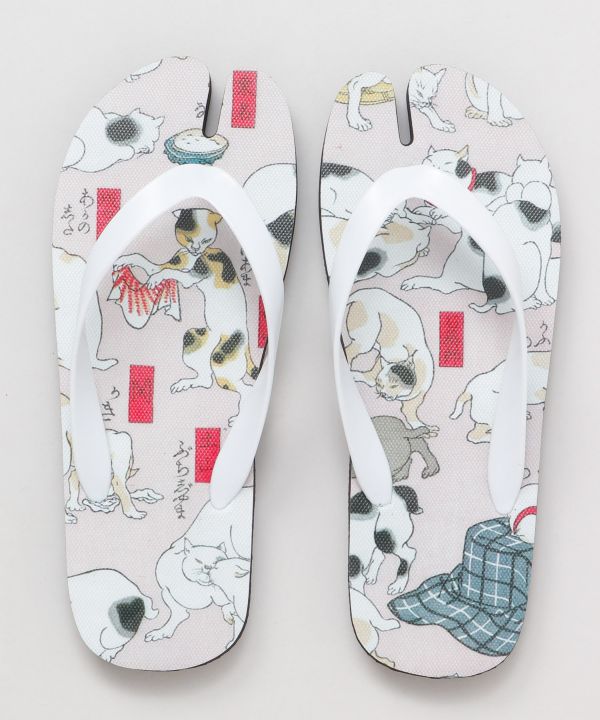 浮世絵の柄を大胆に描いた足袋型ビーチサンダル。枠から取り外してビーチサンダルとして履けるのはもちろん、インテリアとしてそのまま飾ることも出来ます。足先が足袋型になっているので、足袋靴下との相性もばっちり。夏の和装や浴衣にぴったりです。フラットに収納出来るので、アウトドアや旅行のお供、お土産としてもおすすめです。