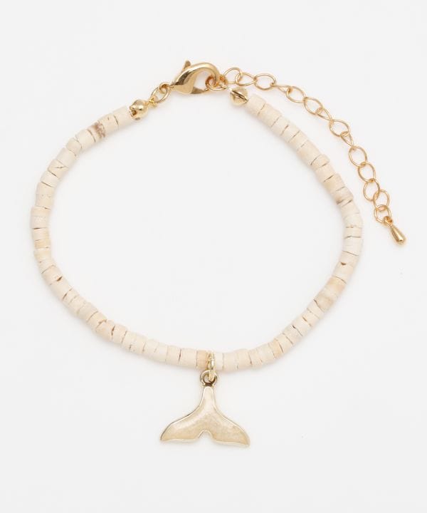 ウッドビーズとホエールテールのブレスレット。ホエールテールは幸運を祈るアイテムとして、大人気のモチーフです。