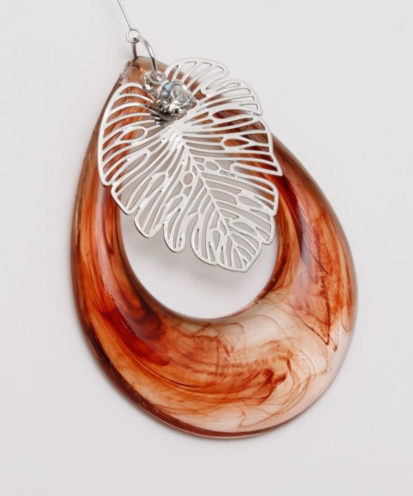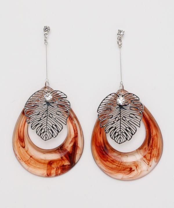 透かしのモンステラが綺麗なピアス。ナチュラルカラーの大き目なチャームがモンステラをひきたてます。きらっと光るラインストーンがポイントです。