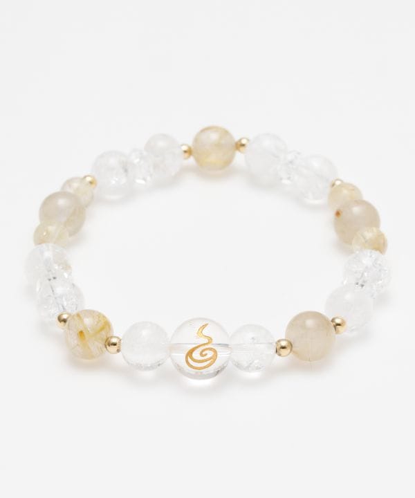 日本神話の神様をイメージしたブレスレット。ルチルクォーツ(針入り水晶)【財運招来】強力な財運を持つ水晶。自信・決断力を与え、事業促進にも力を発揮すると云われています。クラッククォーツ(爆裂水晶)【心身浄化・邪気払い】クラック(割れ)がネガティブな気を吸収し、持ち主に幸運をもたらすと云われています。水晶の開運力にプラスして、悪運や邪念を吸収し浄化することで、精神的な安定をもたらすことから、心身のバランスを整える健康のお守りとしても人気です。クリスタル(水晶)【幸運到来・疲労浄化】全てを浄化し幸運を招き、潜在能力を引き出すと云われる天然石。邪気吸収の力が最も強く、全能的な力を持つとされています。