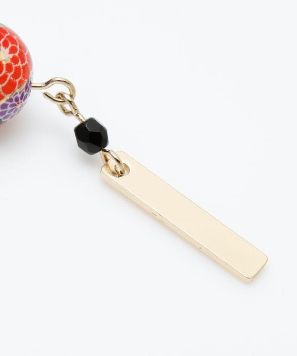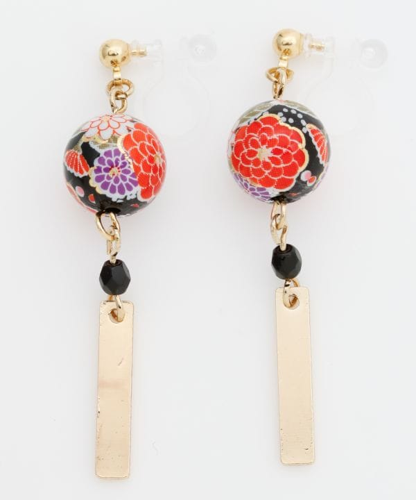 和柄のビーズとメタリックパーツを使用したイヤリング。シンプルながらもしっかりとした存在感があり、様々なシーンやコーディネートに合わせられます。