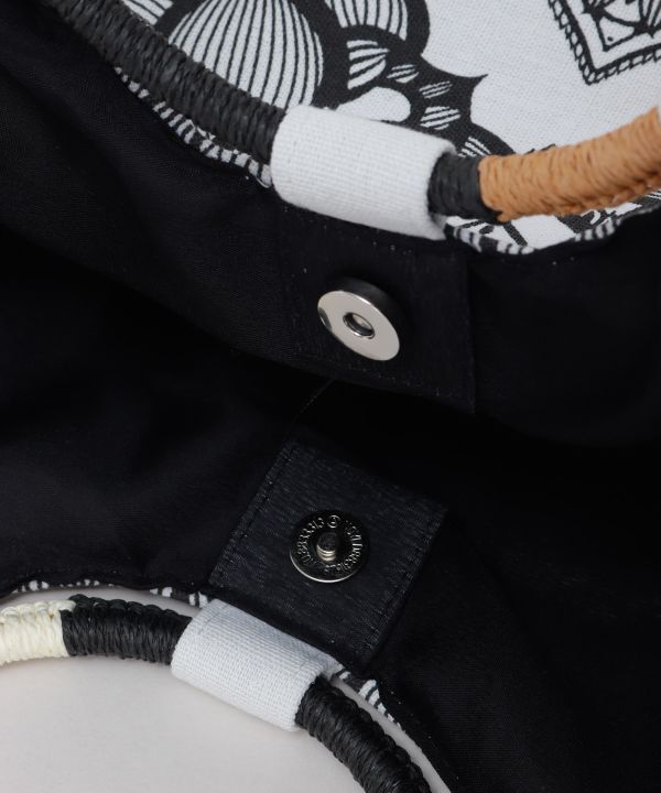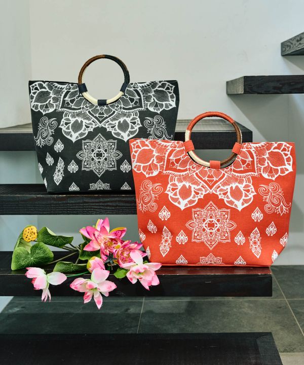 【Amina×VORRUK】大きな蓮が咲き誇る。タイのアーティストVORRRUKとのコラボアイテム。大きなリングハンドルとたっぷりサイズのマチで大容量なのが嬉しいポイント。開口部はマグネットボタン付なので、安心して持ち運べます。機能性とデザイン性を兼ね備えた万能バッグです。