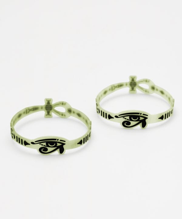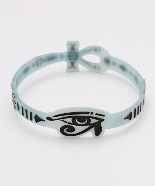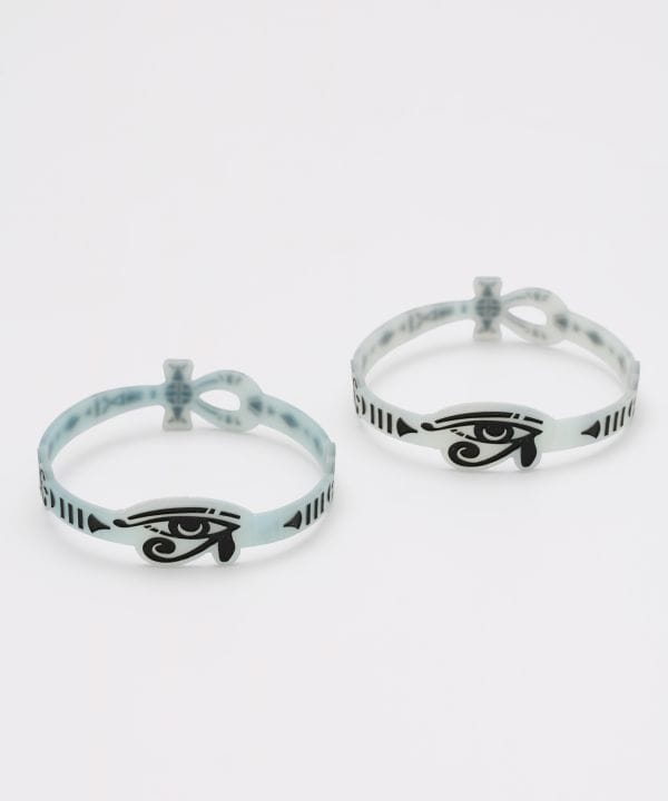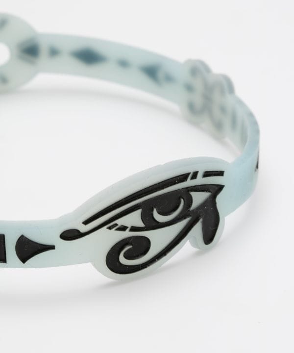 紫外線を浴びると色が変化するラバー素材のアンクレット。古代エジプトのヒエログリフをモチーフに、【アンク】は生命の鍵・不滅の生命力を。【ラーの目】は全てを見通す太陽神ラーの右目を表しています。旅先やアウトドアにも映える神秘的なアクセントに。
