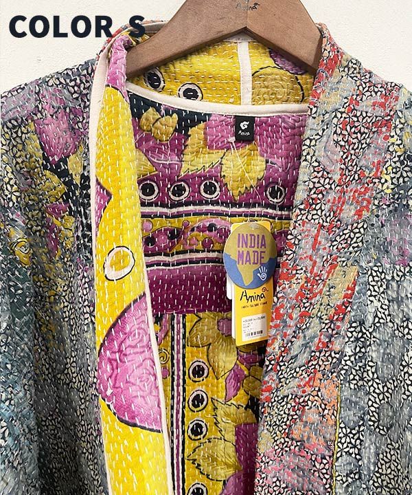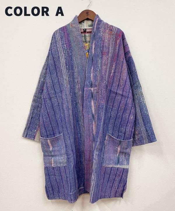 パッチワークが目を惹くロングガウン。ヴィンテージのやわらかくなったサリー、ドーティと呼ばれる男性用の腰巻、ランニングステッチをびっしりとほどこした「カンタ」と呼ばれる布を使用。父母から受け継いで作られたカンタには、悪いものから身を守る力があるとされている。全てアソートで、一点ものに出会えるのも魅力。ユニセックスに着用可能。左右にひとつずつポケット付き。