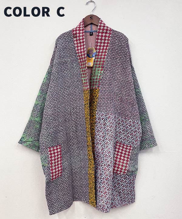 パッチワークが目を惹くロングガウン。ヴィンテージのやわらかくなったサリー、ドーティと呼ばれる男性用の腰巻、ランニングステッチをびっしりとほどこした「カンタ」と呼ばれる布を使用。父母から受け継いで作られたカンタには、悪いものから身を守る力があるとされている。全てアソートで、一点ものに出会えるのも魅力。ユニセックスに着用可能。左右にひとつずつポケット付き。