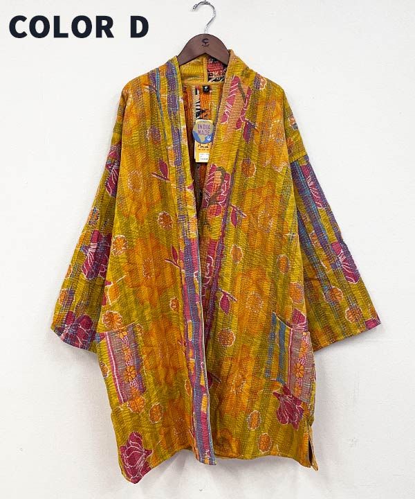 パッチワークが目を惹くロングガウン。ヴィンテージのやわらかくなったサリー、ドーティと呼ばれる男性用の腰巻、ランニングステッチをびっしりとほどこした「カンタ」と呼ばれる布を使用。父母から受け継いで作られたカンタには、悪いものから身を守る力があるとされている。全てアソートで、一点ものに出会えるのも魅力。ユニセックスに着用可能。左右にひとつずつポケット付き。