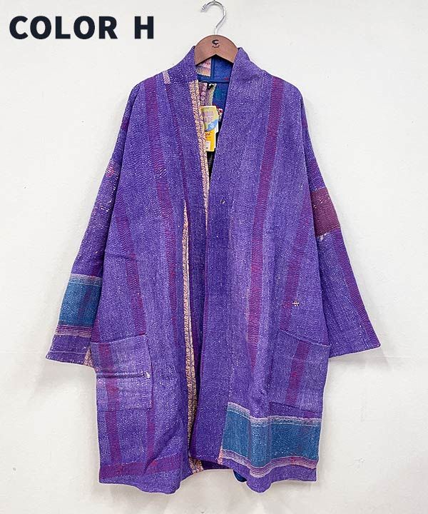 パッチワークが目を惹くロングガウン。ヴィンテージのやわらかくなったサリー、ドーティと呼ばれる男性用の腰巻、ランニングステッチをびっしりとほどこした「カンタ」と呼ばれる布を使用。父母から受け継いで作られたカンタには、悪いものから身を守る力があるとされている。全てアソートで、一点ものに出会えるのも魅力。ユニセックスに着用可能。左右にひとつずつポケット付き。