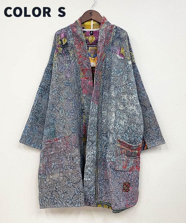 パッチワークが目を惹くロングガウン。ヴィンテージのやわらかくなったサリー、ドーティと呼ばれる男性用の腰巻、ランニングステッチをびっしりとほどこした「カンタ」と呼ばれる布を使用。父母から受け継いで作られたカンタには、悪いものから身を守る力があるとされている。全てアソートで、一点ものに出会えるのも魅力。ユニセックスに着用可能。左右にひとつずつポケット付き。