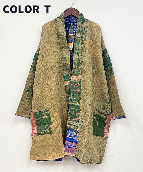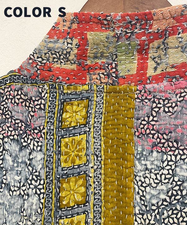 パッチワークが目を惹くロングガウン。ヴィンテージのやわらかくなったサリー、ドーティと呼ばれる男性用の腰巻、ランニングステッチをびっしりとほどこした「カンタ」と呼ばれる布を使用。父母から受け継いで作られたカンタには、悪いものから身を守る力があるとされている。全てアソートで、一点ものに出会えるのも魅力。ユニセックスに着用可能。左右にひとつずつポケット付き。