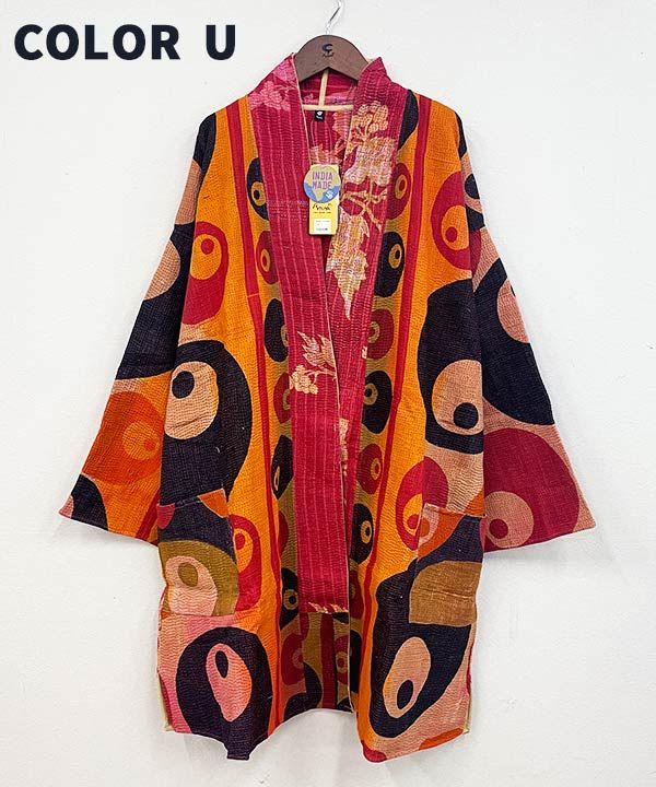 パッチワークが目を惹くロングガウン。ヴィンテージのやわらかくなったサリー、ドーティと呼ばれる男性用の腰巻、ランニングステッチをびっしりとほどこした「カンタ」と呼ばれる布を使用。父母から受け継いで作られたカンタには、悪いものから身を守る力があるとされている。全てアソートで、一点ものに出会えるのも魅力。ユニセックスに着用可能。左右にひとつずつポケット付き。