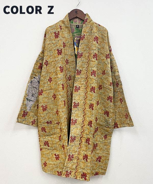 パッチワークが目を惹くロングガウン。ヴィンテージのやわらかくなったサリー、ドーティと呼ばれる男性用の腰巻、ランニングステッチをびっしりとほどこした「カンタ」と呼ばれる布を使用。父母から受け継いで作られたカンタには、悪いものから身を守る力があるとされている。全てアソートで、一点ものに出会えるのも魅力。ユニセックスに着用可能。左右にひとつずつポケット付き。
