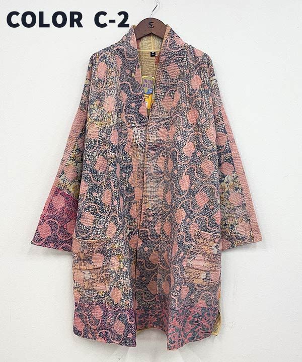 パッチワークが目を惹くロングガウン。ヴィンテージのやわらかくなったサリー、ドーティと呼ばれる男性用の腰巻、ランニングステッチをびっしりとほどこした「カンタ」と呼ばれる布を使用。父母から受け継いで作られたカンタには、悪いものから身を守る力があるとされている。全てアソートで、一点ものに出会えるのも魅力。ユニセックスに着用可能。左右にひとつずつポケット付き。