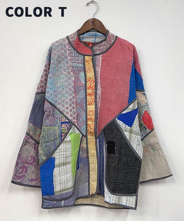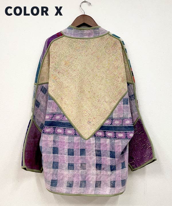 パッチワークが目を惹くジャケット。ヴィンテージのやわらかくなったサリー、ドーティと呼ばれる男性用の腰巻、ランニングステッチをびっしりとほどこした「カンタ」と呼ばれる布を使用。父母から受け継いで作られたカンタには、悪いものから身を守る力があるとされている。全てアソートで、一点ものに出会えるのも魅力。ユニセックスに着用可能。両脇にひとつずつポケット有。
