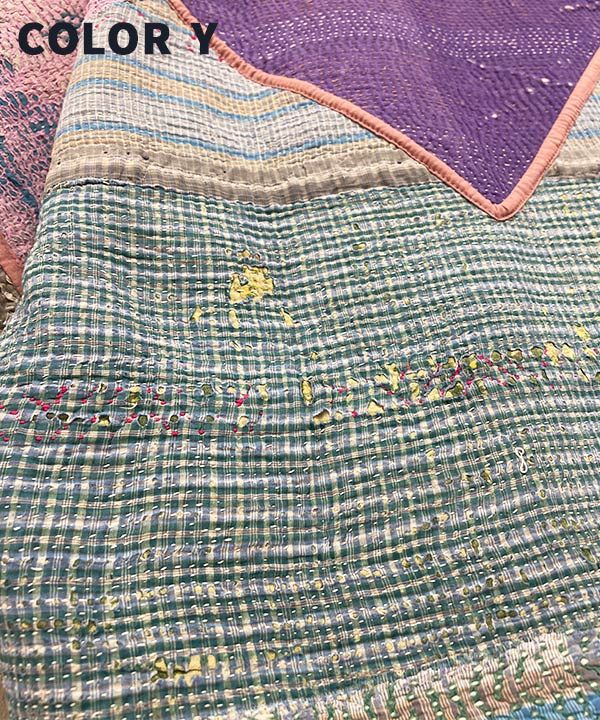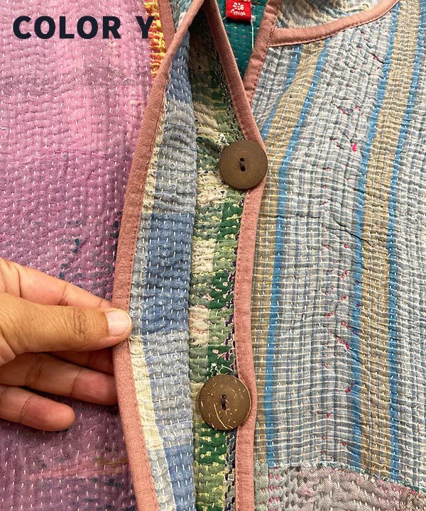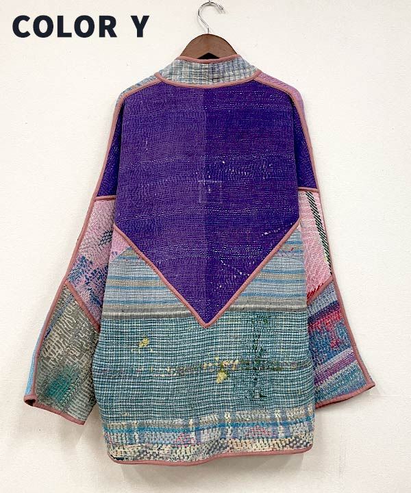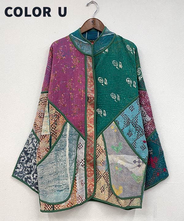 パッチワークが目を惹くジャケット。ヴィンテージのやわらかくなったサリー、ドーティと呼ばれる男性用の腰巻、ランニングステッチをびっしりとほどこした「カンタ」と呼ばれる布を使用。父母から受け継いで作られたカンタには、悪いものから身を守る力があるとされている。全てアソートで、一点ものに出会えるのも魅力。ユニセックスに着用可能。両脇にひとつずつポケット有。