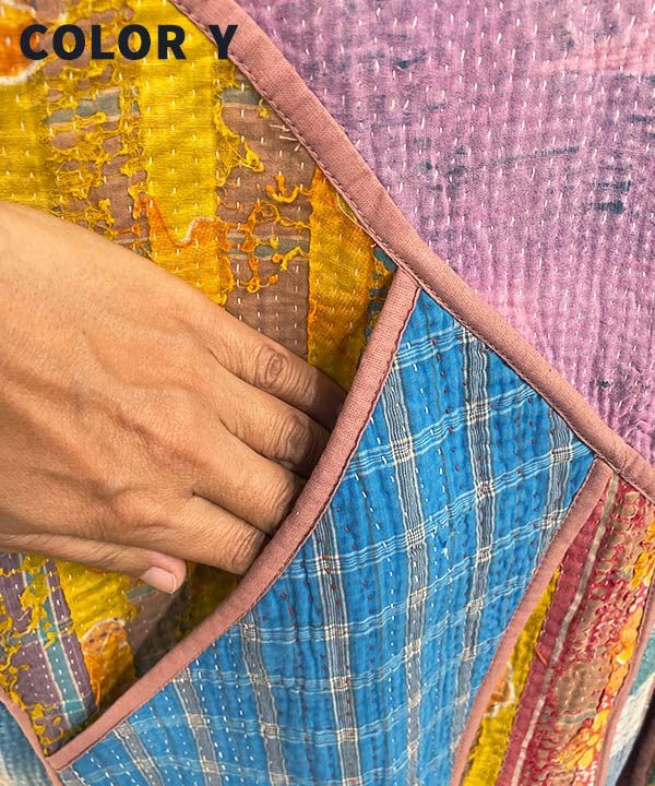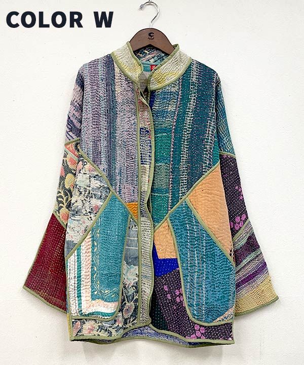 パッチワークが目を惹くジャケット。ヴィンテージのやわらかくなったサリー、ドーティと呼ばれる男性用の腰巻、ランニングステッチをびっしりとほどこした「カンタ」と呼ばれる布を使用。父母から受け継いで作られたカンタには、悪いものから身を守る力があるとされている。全てアソートで、一点ものに出会えるのも魅力。ユニセックスに着用可能。両脇にひとつずつポケット有。
