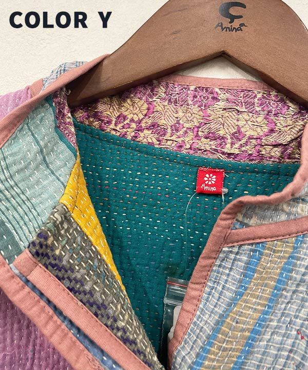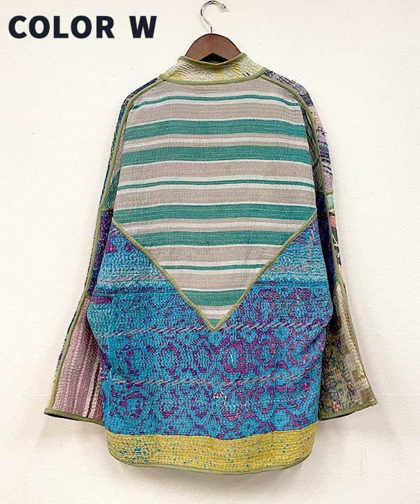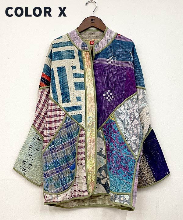 パッチワークが目を惹くジャケット。ヴィンテージのやわらかくなったサリー、ドーティと呼ばれる男性用の腰巻、ランニングステッチをびっしりとほどこした「カンタ」と呼ばれる布を使用。父母から受け継いで作られたカンタには、悪いものから身を守る力があるとされている。全てアソートで、一点ものに出会えるのも魅力。ユニセックスに着用可能。両脇にひとつずつポケット有。