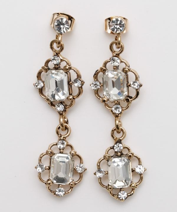 ヨーロッパのアンティークマーケットで出会ったような、クラシカルな印象のピアスです。ふんだんにあしらわれたビジューがキラキラと輝きを放ちます。特別なお出かけや、パーティーシーンにもぴったり。