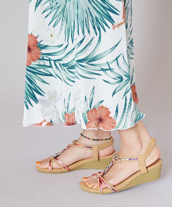 プリーツカットソーのワンピース。肩紐で着丈調整可能。パンツとのセットアップ着用もおすすめ。しわになりにくい素材です。