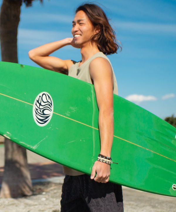 レザーやココナッツウッドを組み合わせた4本セットのメンズブレスレット。幸運を吊り上げるという意味合いを持つフィッシュフックのチャームがポイントです。