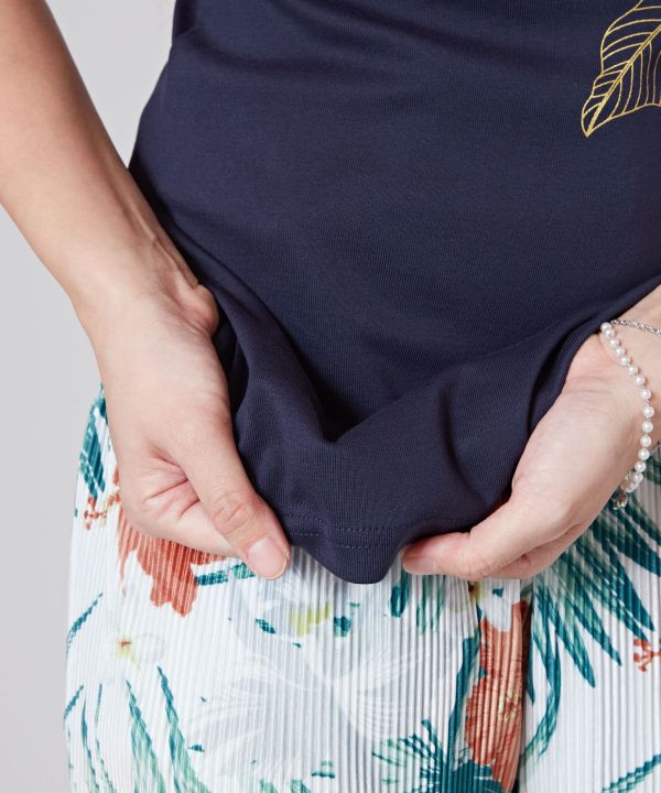 華やかなハワイの花のブーケ風デザインのフラTシャツ。着心地が良く、着丈も長めでフラのレッスン着としても活躍します。