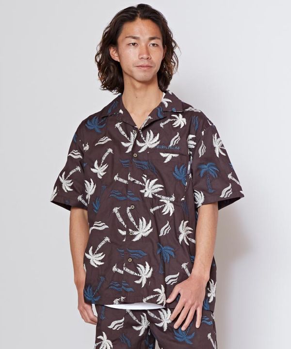 ヤシ柄のメンズアロハシャツ。存在感があり、ナチュラルなカラーリングの総柄刺しゅうのデザイン。ハワイ感が満載でパンツとのセットアップ着用もおすすめ。