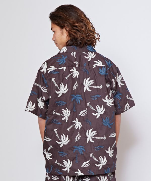 ヤシ柄のメンズアロハシャツ。存在感があり、ナチュラルなカラーリングの総柄刺しゅうのデザイン。ハワイ感が満載でパンツとのセットアップ着用もおすすめ。