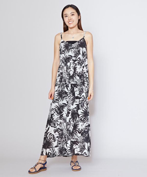 ハワイを感じさせるカラフルさと、ボタニカル柄のキャミワンピース。さらりと着られる綿レーヨンのクレープ素材は、肌に張り付かないので汗をかく時にもおすすめ。肩紐は長さの調整可能。上にトップスを重ね着しても。