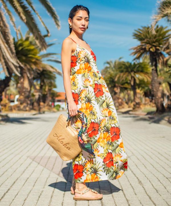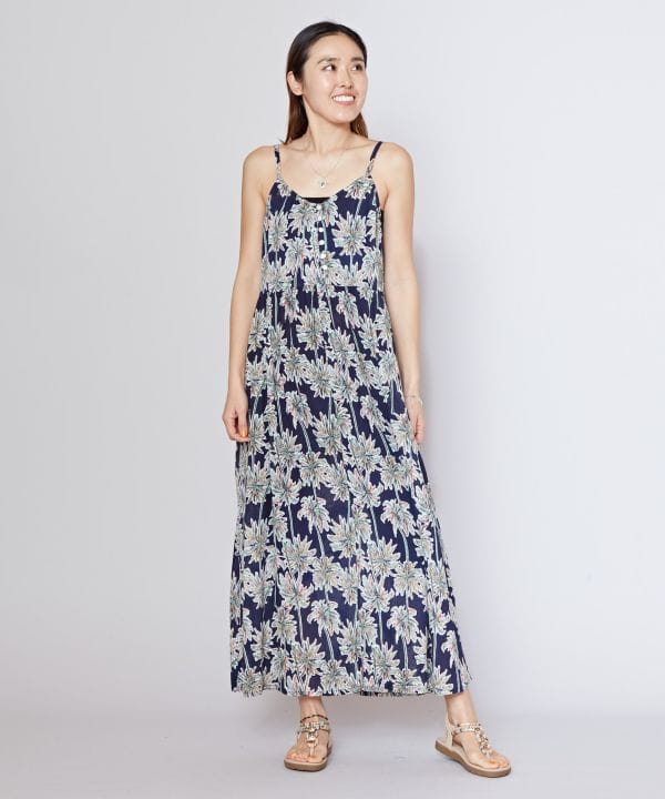 ハワイを感じさせるカラフルさと、ボタニカル柄のキャミワンピース。さらりと着られる綿レーヨンのクレープ素材は、肌に張り付かないので汗をかく時にもおすすめ。肩紐は長さの調整可能。上にトップスを重ね着しても。