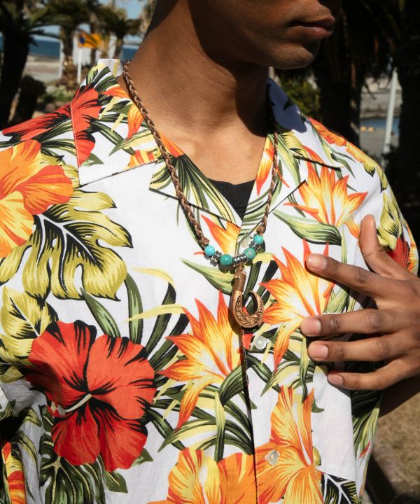 幸運を吊り上げると伝わるフィッシュフックモチーフのウッド調のネックレス。ポリネシアントライバルがハワイの力強さを感じるデザインです。