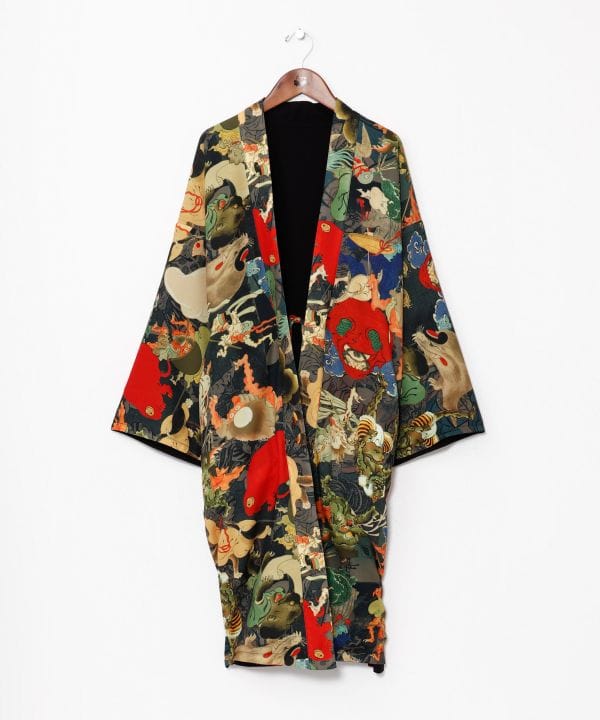 着る、NIPPON ART さらりとした着心地のリバーシブル着物羽織。「生き物」「妖怪」「神仏」をモチーフに、日本の様々な浮世絵をコラージュデザインしたカヤならではのオリジナル柄。シワになりにくく、お手入れも簡単なポリエステル生地。ゆったりとしたサイズ感で、性別問わず着られます。