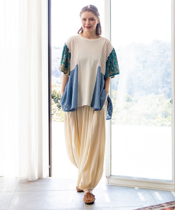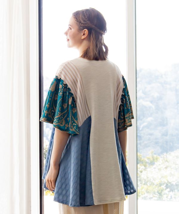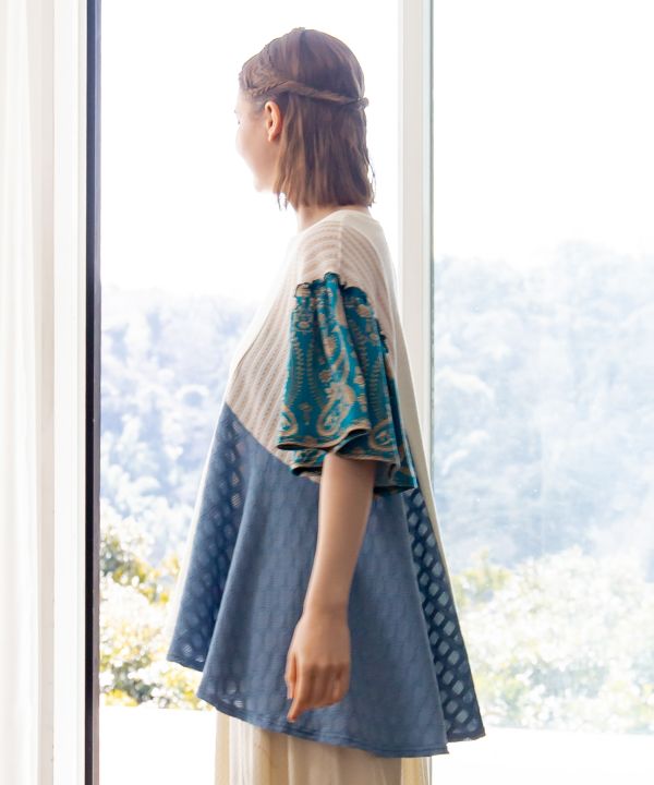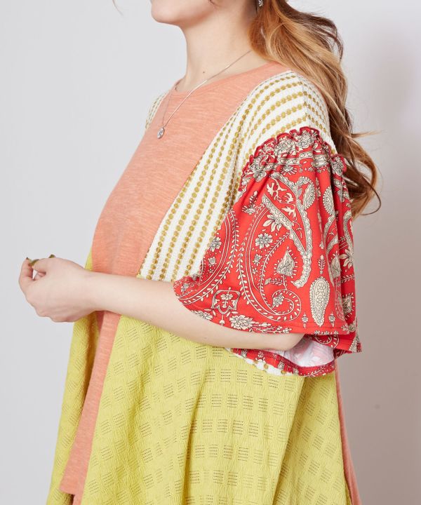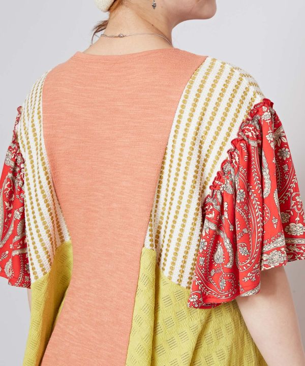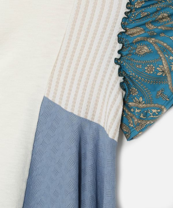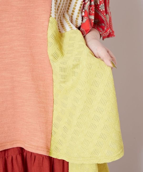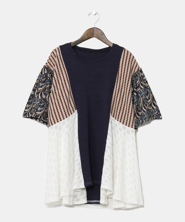 表面感のあるカットソーに異素材を組み合わせたパッチワークトップス。リメイクしたような個性的なデザイン。軽やかさを感じられるフィッシュテールのビッグシルエットで体型レスに着られる普段使いしやすいアイテム。