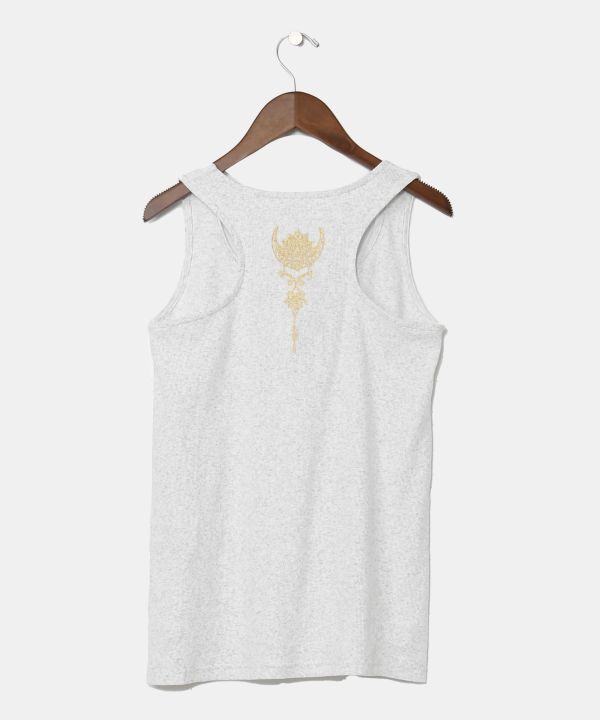 ロータスの箔プリントが大胆なタンクトップ。着回ししやすいカラー展開でシャツでもカーディガンでも合わせやすい万能アイテム。トップスとしてもインナーとしても着用可能。