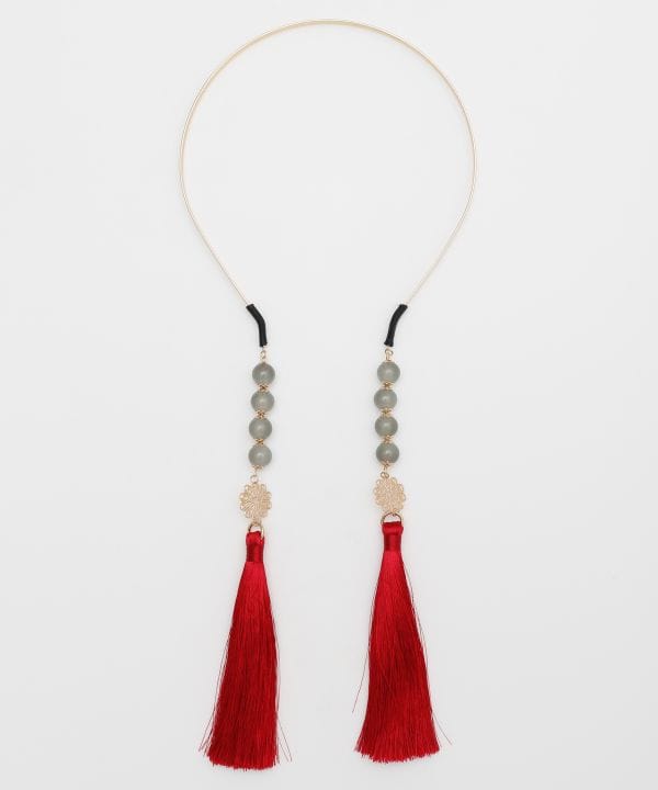 艶のあるタッセルと透け感のあるビーズのカチューシャ。着けると耳の裏からタッセルがゆらゆらと揺れ、イヤーフックのようなシルエットになります。