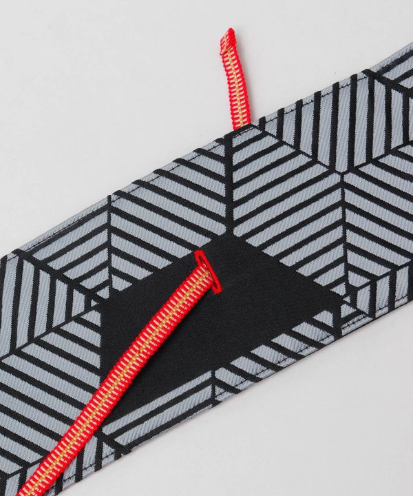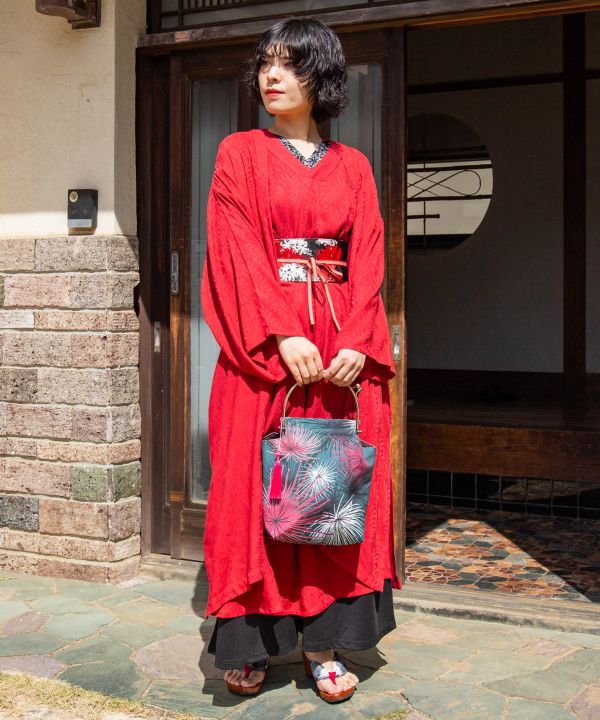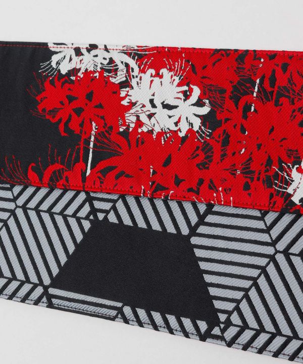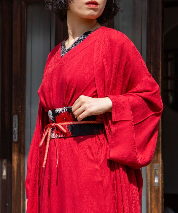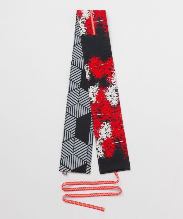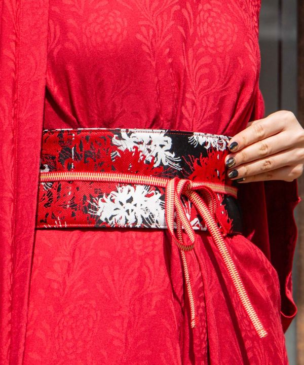 巻いて紐を結ぶだけの簡単帯ベルト。彼岸花と亀甲文様の組み合わせで、女性らしいコーデもモダンなコーデも決まります。帯のヒモ部分は、丈夫で伸びにくい日本の伝統的な真田紐(さなだひも)を使用。リバーシブル仕様なので、コーデに合わせて柄を変えることができます。