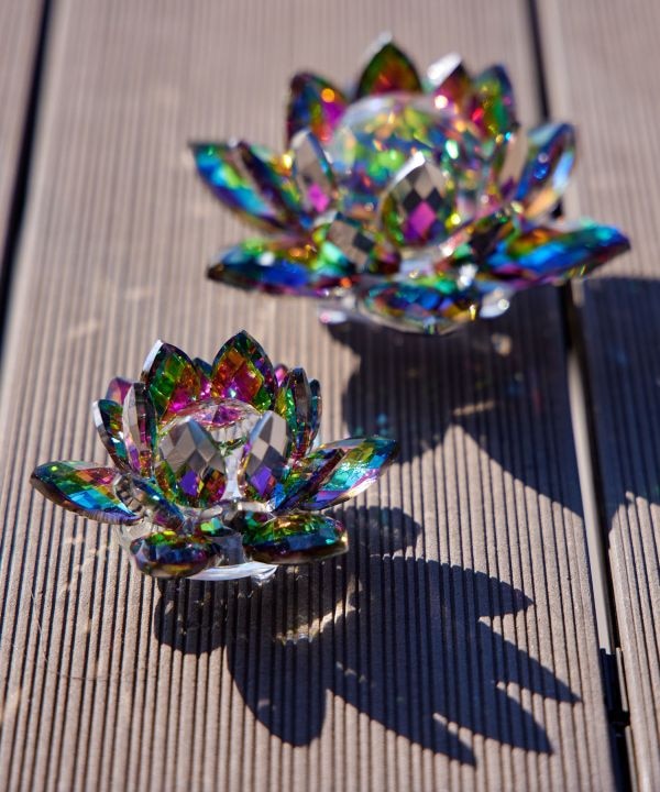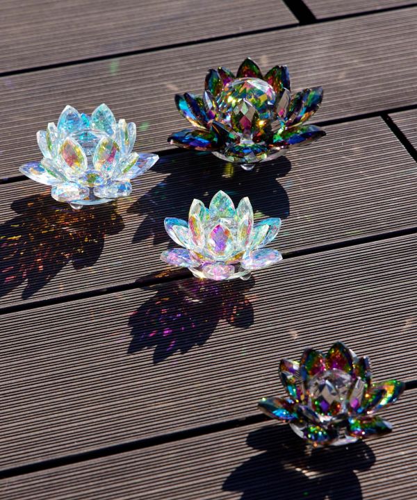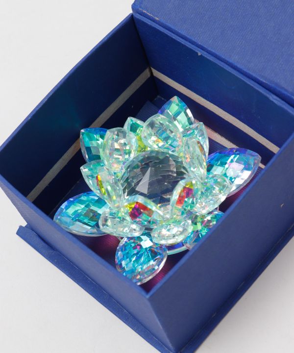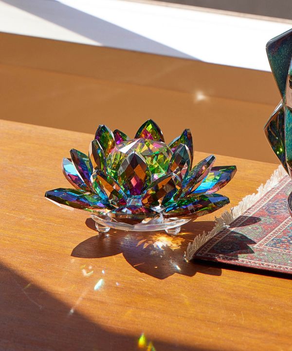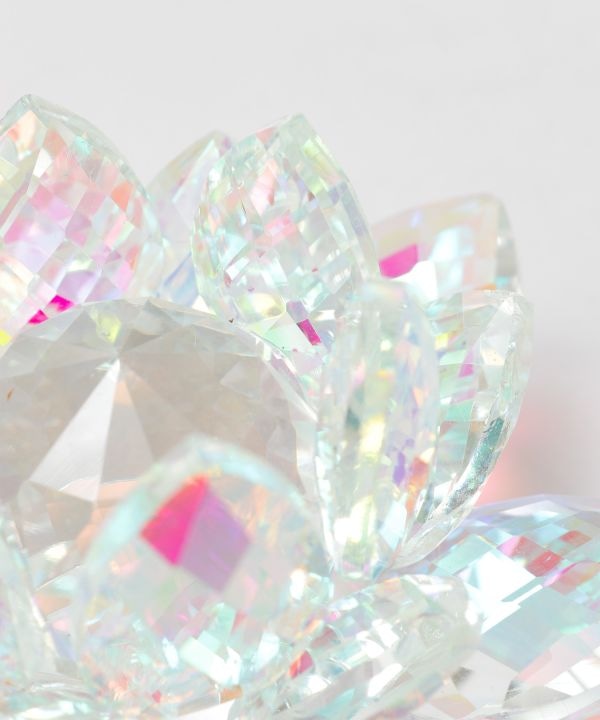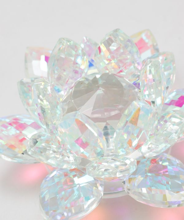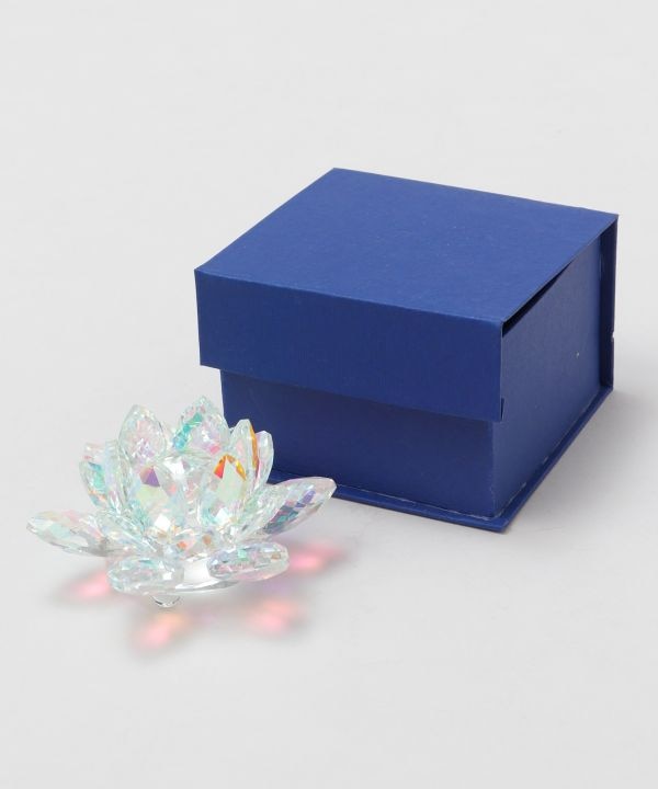 オリエンタルな雰囲気漂うガラスロータスのオブジェ。泥水の中から美しい大輪の花を咲かせる蓮は「浄化・再生」の意味を持つと云われる。太陽の光が重なったガラスの花びらに反射し、部屋中に美しい光を散りばめます。「邪視除け」「魔除け」の意味を持つミラーを入れ込みました。光の「陽」の運気を取り入れ幸せを運びこもう。