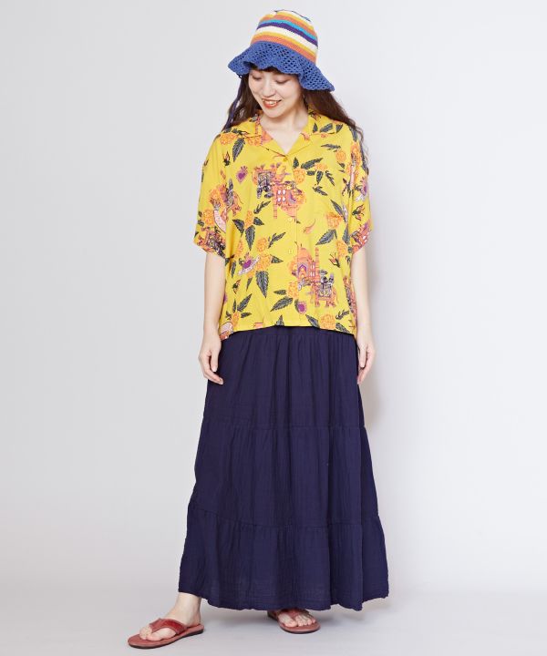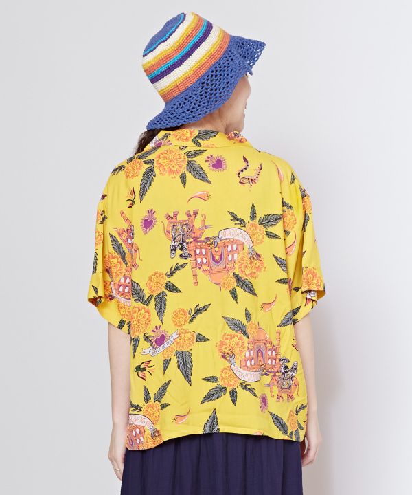 メキシコとインドのモチーフが融合したゆったりとした身幅のレディースシャツ。旅するカラベラがゾウに乗ってインドへ訪問。神聖な意味を持つマリーゴールドはインドとメキシコには欠かせない花です。アロハシャツ、花柄シャツに挑戦してみたい方へおすすめ。さらっと着られて涼しいレーヨン素材。