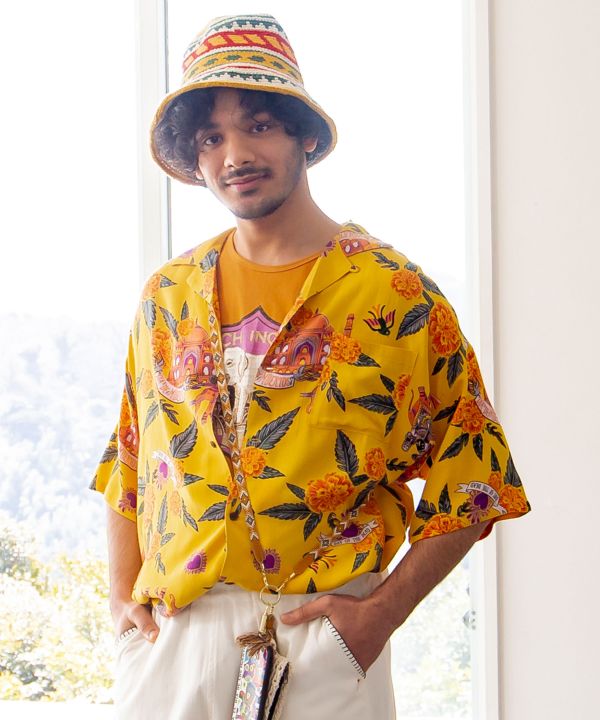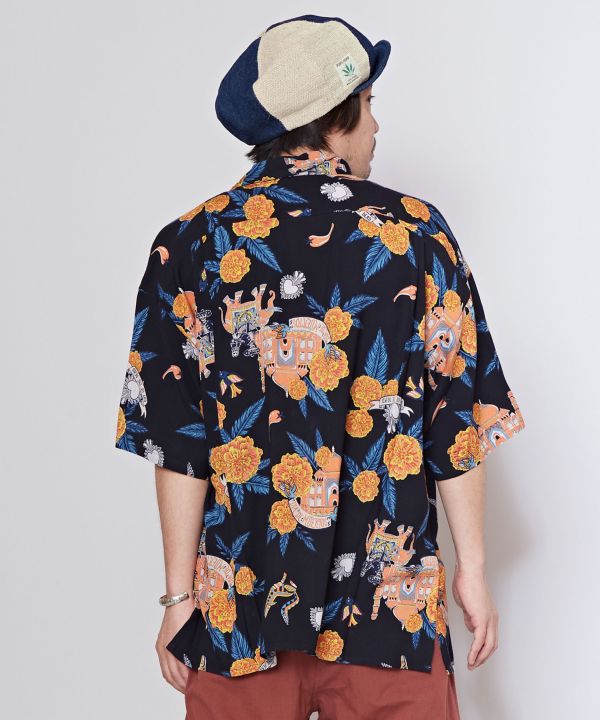 旅するカラベラがゾウに乗ってインドへ訪問。メキシコとインドのモチーフが融合した一枚。神聖な意味を持つマリーゴールドはインドとメキシコには欠かせない花です。アロハシャツ、花柄シャツに挑戦してみたい方へおすすめ。ゆったりとした身幅のメンズシャツ。開襟シャツで首回りも涼しく、さらっと着られて涼しいレーヨン素材。