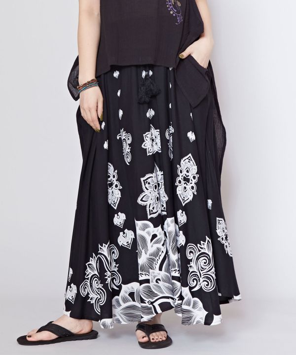 【Amina×VORRUK】タイのアーティストVORRUKとのコラボ。力強いロータスの絵を単色のプリントで落とし込んだ変形のスカート。柔らかくて涼しいレーヨン素材で着心地抜群。たっぷりしたドレープで動きのあるシルエットが出せる。普段のコーディネートにも合わせやすい大胆なアイテム。