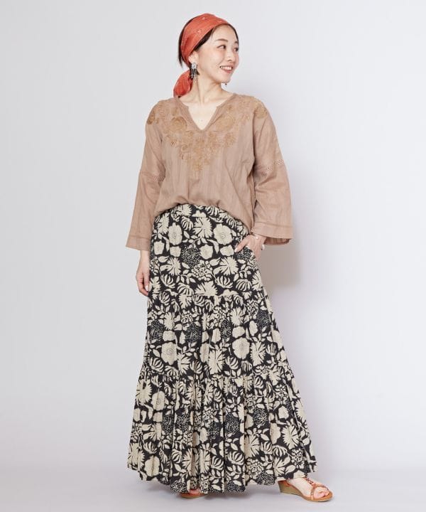 コットンドビー素材の清涼感のある生地のトップス。7分丈で強い日差しから肌を守ってくれる。ウズベキスタンの伝統文化が光る、大胆なスザニ風の刺しゅう。ロングテールトップスで優しいシルエットを演出。こなれ感のあるニュアンスカラーな色展開です。